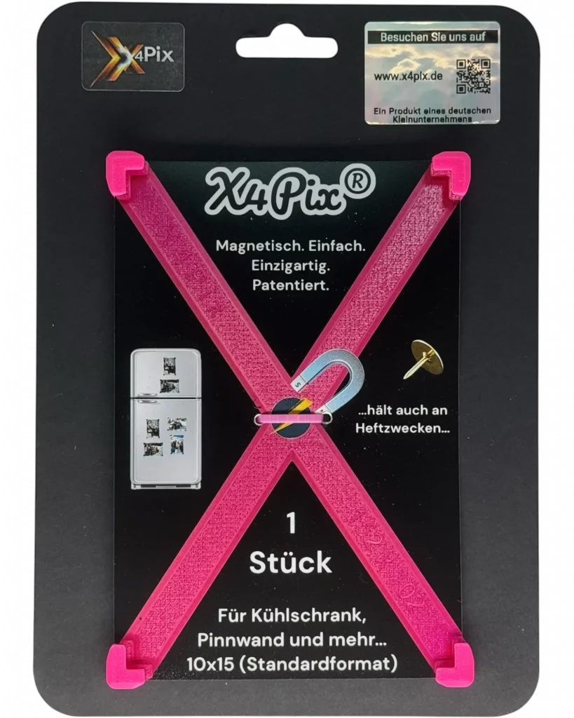 Das patentierte X4Pix® Magnetsystem zeigt Fotos auf eine besondere Art: Vier dezente Eckelemente halten das Bild sicher und setzen gezielte Farbakzente. So entsteht eine moderne, unaufdringliche Präsentation, bei der das Foto im Mittelpunkt steht. Entwickelt und gefertigt in Deutschland – mit Liebe zum Detail und dem Anspruch, Design und Funktion sinnvoll zu verbinden.